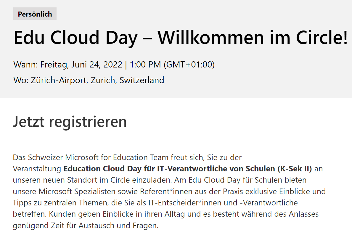 Am Freitag, 24. Juni findet zwischen 13:00 und 16:30 der Edu Cloud Day 2022 am neuen Standort von Microsoft statt.