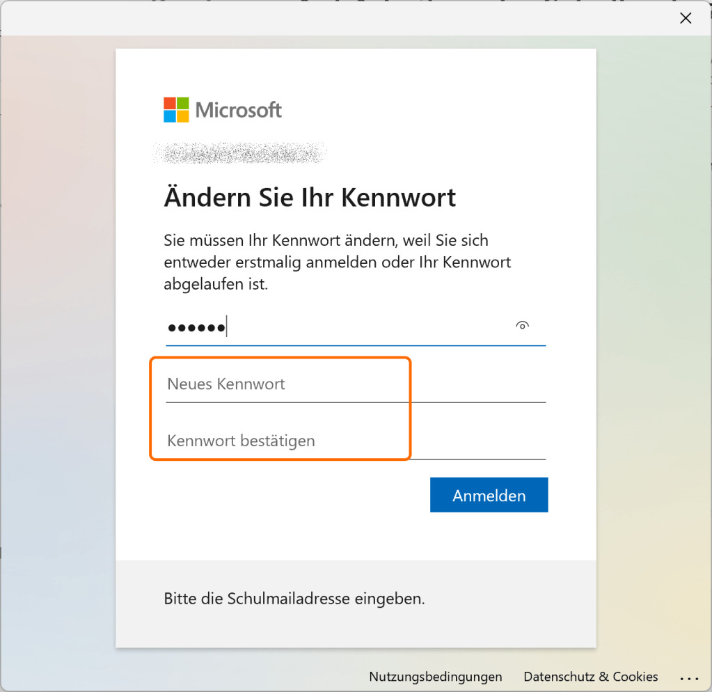 Sobald sich die Schülerin oder der Schüler am Computer anmeldet, bekommt sie oder er die Aufforderung, sich ein neues Passwort zu setzen.