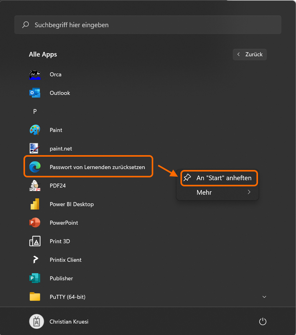 Damit man sich diese Adresse nicht merken muss, kann man einfach das Programm „Passwort von Lernenden zurücksetzen“ öffnen. Wenn man möchte, kann man einen Rechtsklick darauf machen und „An „Start“ anheften“ auswählen.