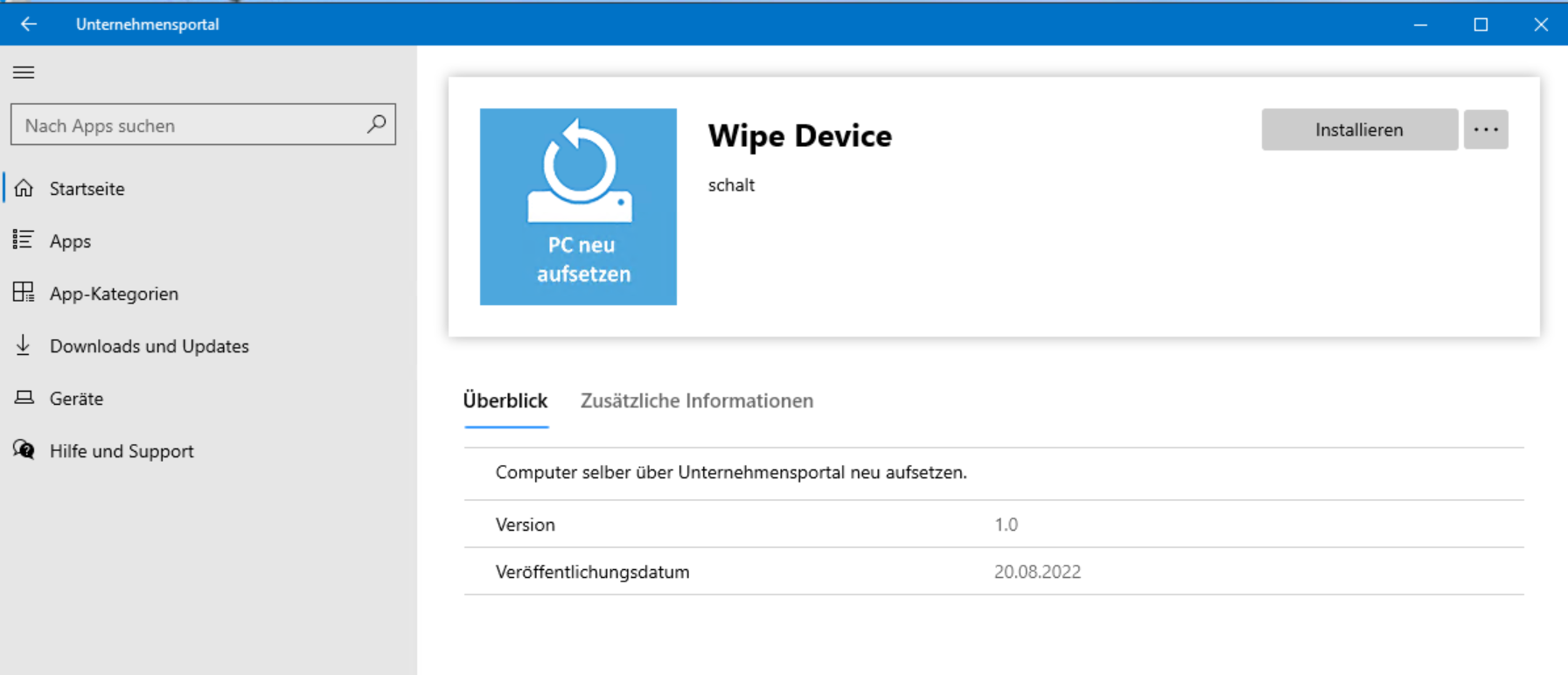 Ideal wäre, wenn die Lehrpersonen den Zeitpunkt für den Wipe selber auslösen könnten. Dafür werden aber Adminrechte benötigt. Auf der Suche nach einer Lösung bin ich über diesen Blog gestossen. Die Idee ist, ein Programm über das Unternehmensportal anzubieten, das man zwar als Standardbenutzer auslösen kann, das aber im Hintergrund als „System“ die benötigten Rechte hat und eigentlich die gleichen Befehle ausführt, wie wenn der Befehl zum Wipe über Intune ausgelöst worden wäre.