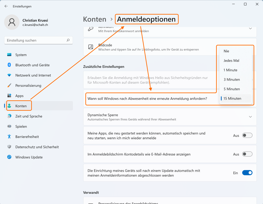 Die Einstellung „Wann soll Windows nach Abwesenheit eine erneute Anmeldung anfordern?“ findet sich unter Einstellungen -> Konten -> Anmeldeoptionen und ist standardmässig auf 15 Minuten eingestellt.