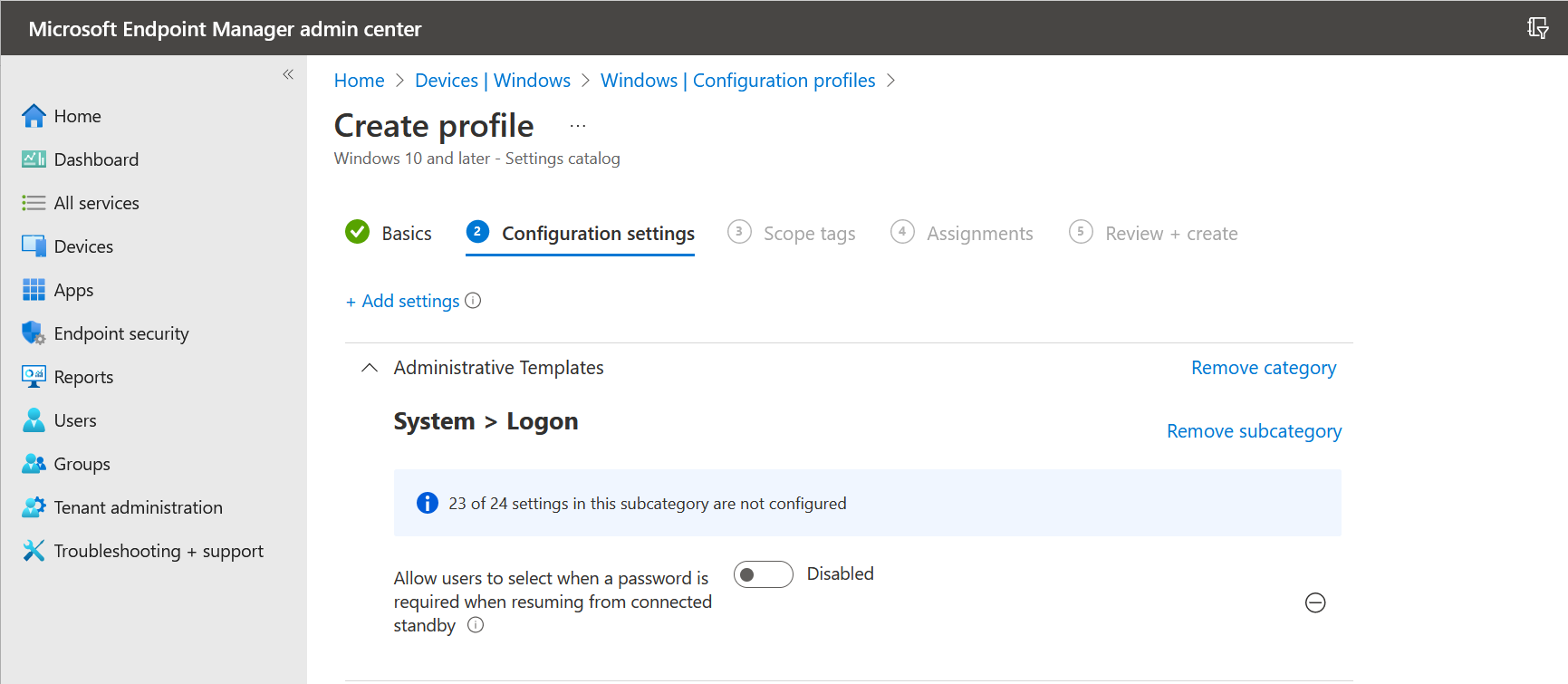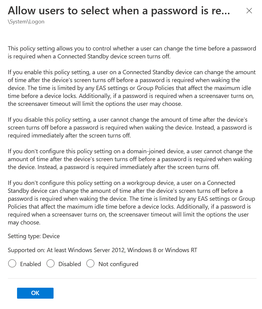 Man kann aber über Intune eine Richtlinie setzen, damit auch die „Azure AD joined“ Computer die sicherere Standardeinstellung erhalten, die Microsoft für Firmengeräte (domain joined) vorsieht. Die Richtlinie heisst: „Allow users to select when a password is required when resuming from connected standby“ und muss auf „Disabled“ gesetzt werden.