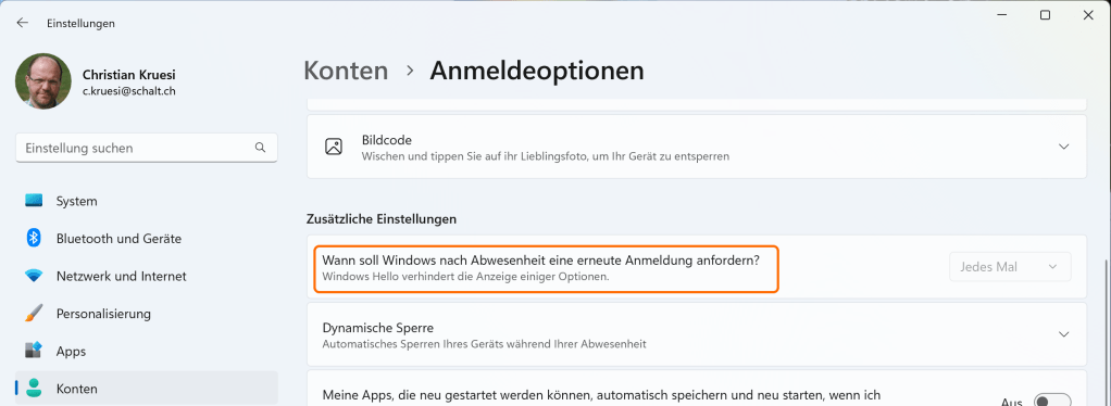 Wenn „Windows Hello for Business“ eingerichtet ist, wird die Einstellung auch automatisch gesetzt. Es heisst dann „Windows Hello verhindert die Anzeige einiger Optionen“.