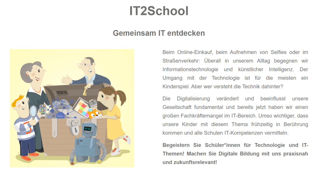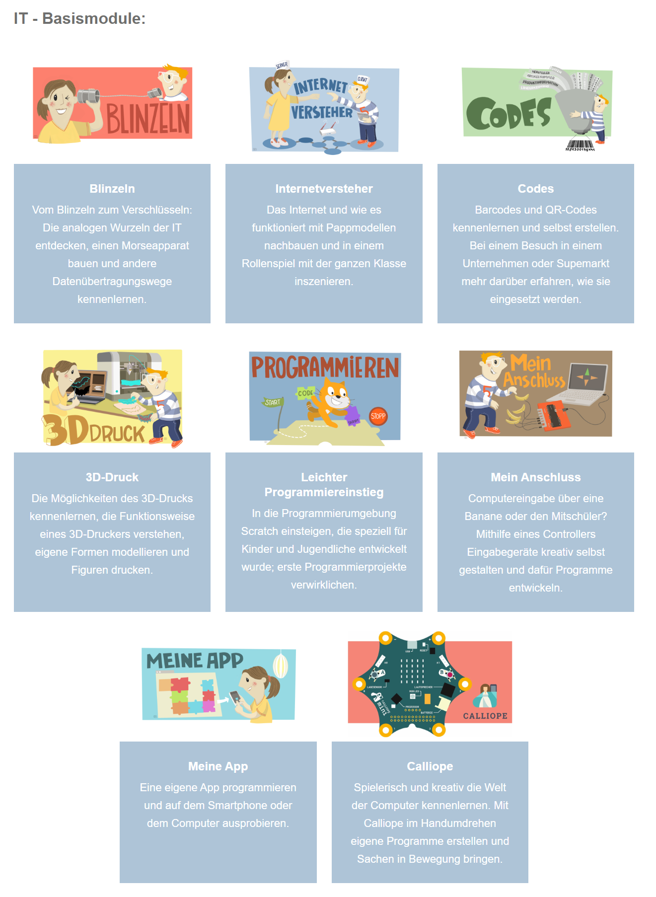 Auf https://www.wissensfabrik.de/it2school/ findet man diverse Module für den Medien- und Informatik Unterricht.