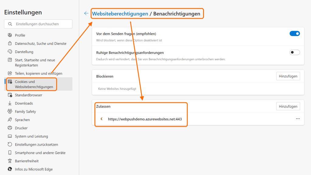Falls man einer Seite die Berechtigung für Benachrichtigungen entziehen will, findet man das bei den Einstellungen von Edge (3 Punkte oben rechts) -> „Cookies und Websiteberechtigungen“ -> „Websiteberechtigungen“ -> „Benachrichtigungen“. Hier noch der Link zu der Anleitung von Microsoft.