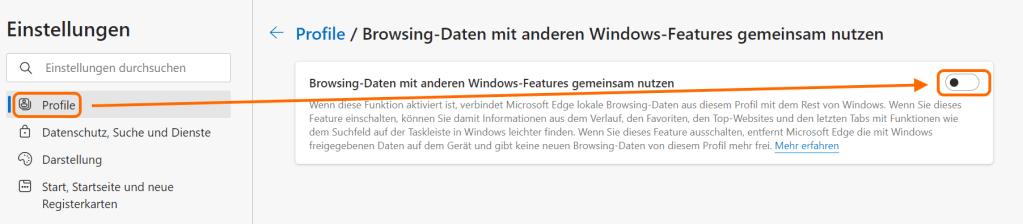 Auch bei den Profilen findet man den Eintrag „Browsing-Daten mit anderen Windows-Features gemeinsam nutzen“.