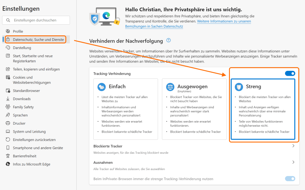 Die Tracking-Verhinderung stelle ich jeweils auf „Streng“.