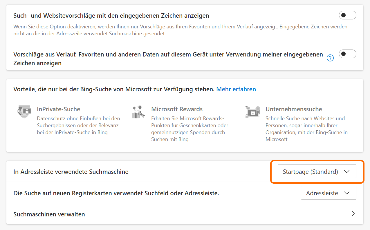 Bei „Adressleiste und Suche“ trage ich meine bevorzugte Suchmaschine „Startpage“ ein. Eine Alternative wäre DuckDuckGo.