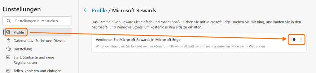 Mit Microsoft Rewards kann man Punkte für Prämien sammeln. Wenn man das nicht möchte, kann man die Rewards bei den Einstellungen unter Profile -> Microsoft Rewards deaktivieren.