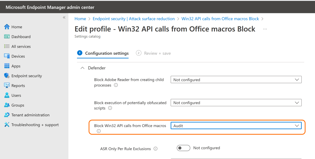 In der Zwischenzeit war klar, dass es an einem Defender Update lag und Microsoft daran war, das Problem durch ein weiteres Update zu beheben (was in der Zwischenzeit passiert ist). Auch klar und in der Zwischenzeit von Microsoft bestätigt war, das man das Problem stoppen konnte, wenn man die ASR Regel „Block Win32 API calls from Office macros“ von „Block“ auf „Audit“ oder „Off“ stellt, was ich nach den ersten Meldungen schon gemacht hatte.