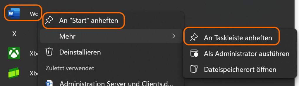 Die wieder hergestellten Programme finden sich unter „Start“ -> „Alle Apps“ und können falls gewünscht durch einen Rechtsklick wieder an Start oder an die Taskleiste angeheftet werden.