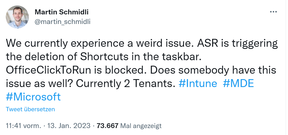Am Freitag hat so eine ASR Regel Verknüpfungen im Startmenü Ordner oder an der Taskleiste angepinnte Verknüpfungen fälschlicherweise als Bedrohung erkannt und gelöscht.