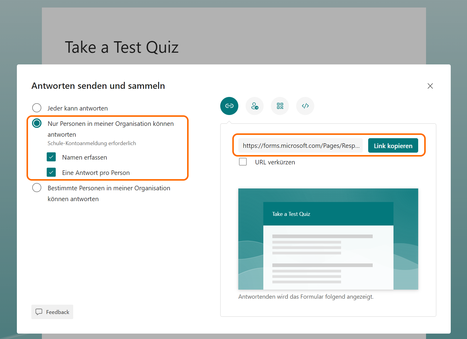 Wichtig ist, dass beim Quiz nur „Eine Antwort pro Person“ ausgewählt ist. Ansonsten könnte man das Quiz anschauen und wieder beenden, im Internet recherchieren und dann das Quiz nochmals öffnen. Den Link kopiert man sich für den nächsten Schritt.