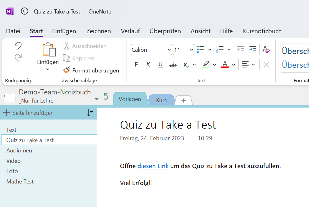 Den Link könnte man den Schülerinnen und Schülern per Mail zur Verfügung stellen, aber wenn man sowieso mit OneNote arbeitet, kann man ihn auch direkt dort speichern.
