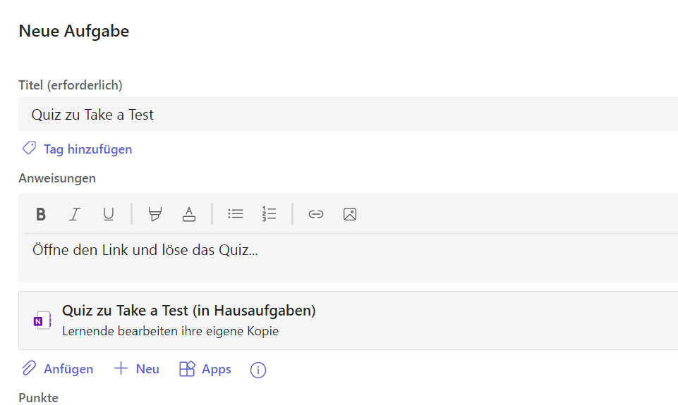 Falls man konsequent mit Teams Aufgaben arbeitet, kann man eine Seite aus dem OneNote Kursnotizbuch als Aufgabe verteilen.