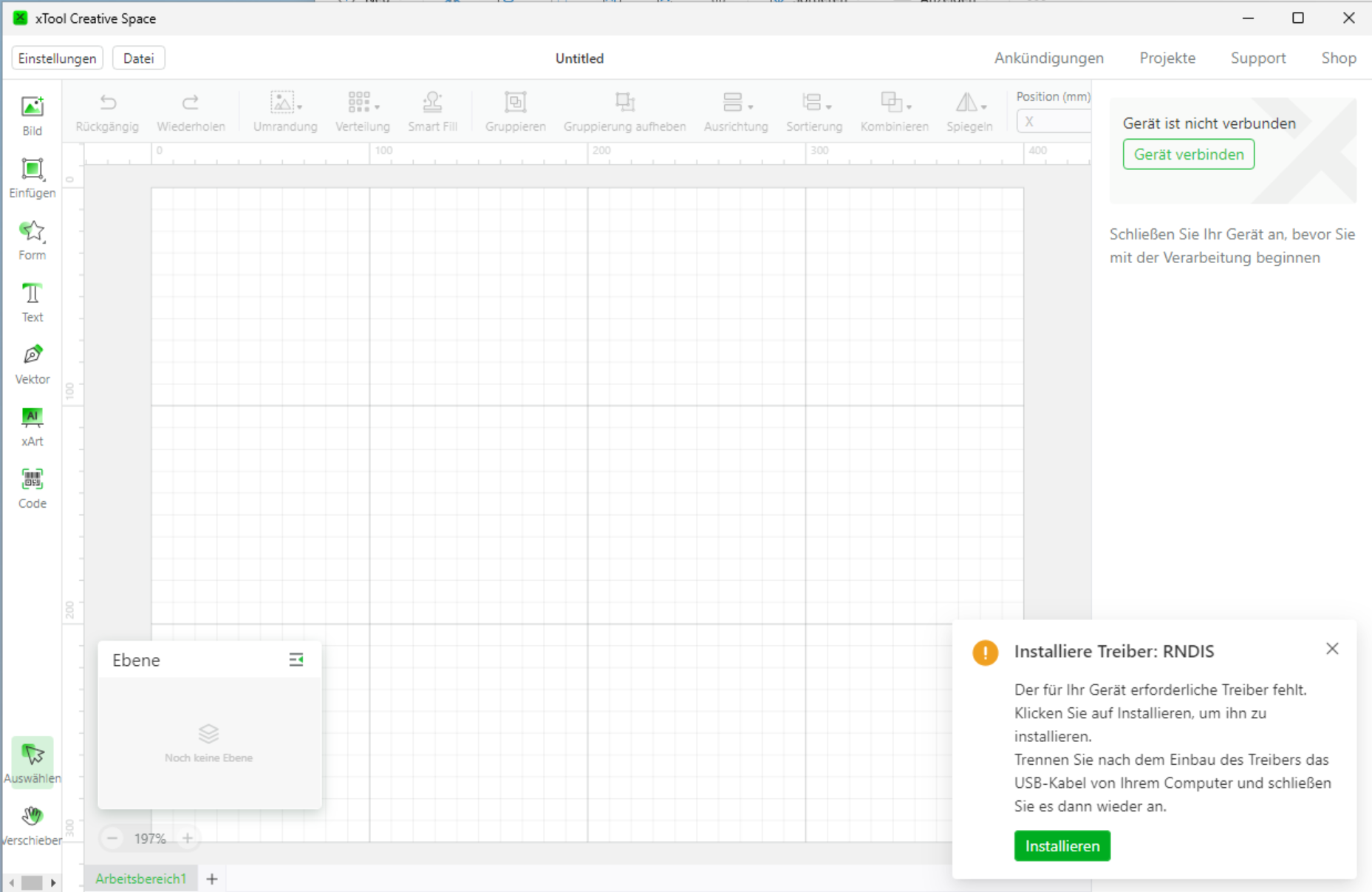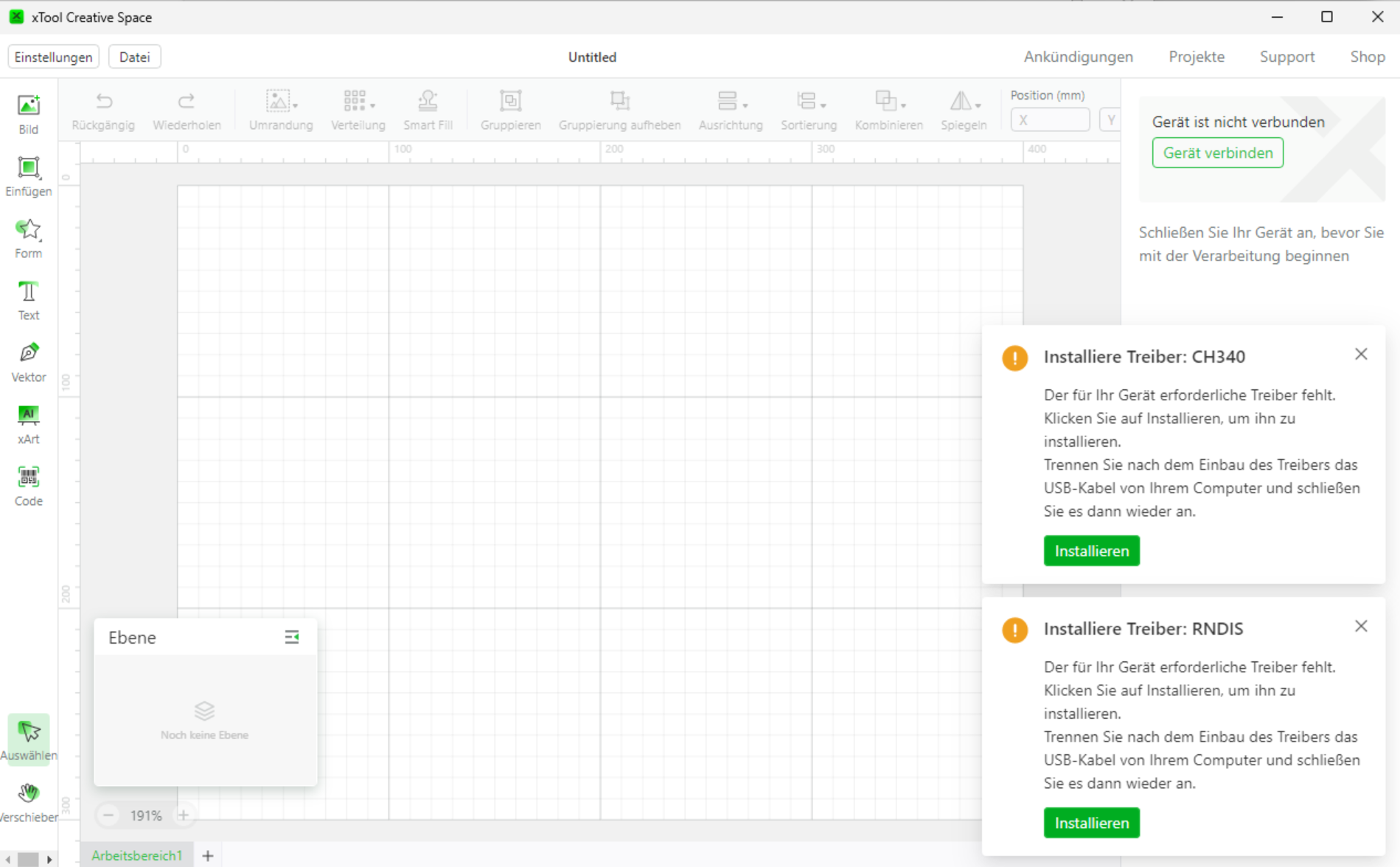 Danach startet das Hauptprogramm ohne Meldungen wegen fehlender Treiber.