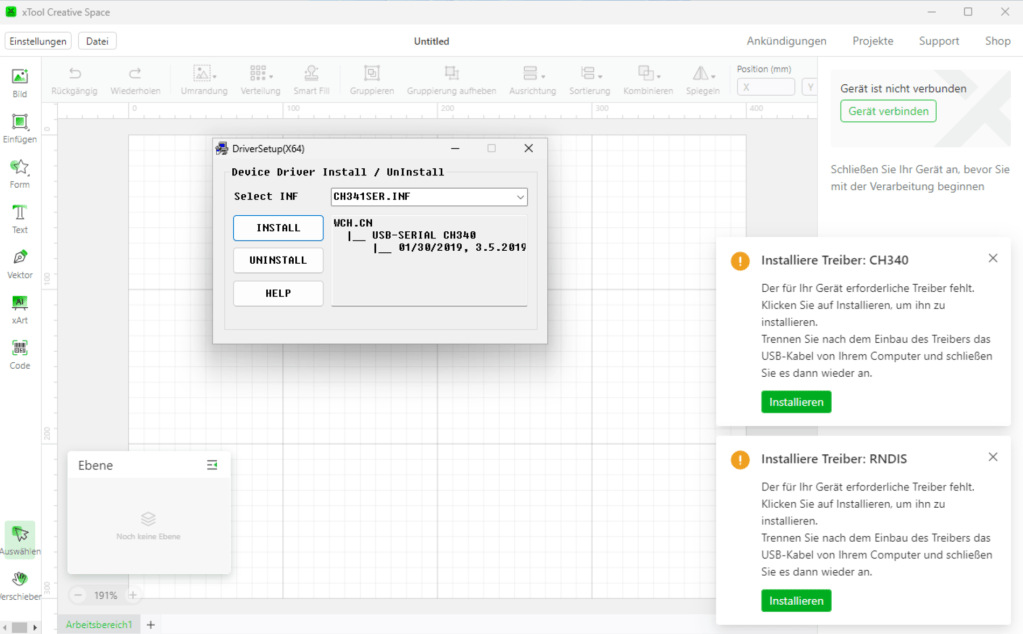 Klickt man beim ersten Treiber (CH340) auf „Installieren“, öffnet sich ein weiteres Fenster, aus dem man den Treiber installieren kann.