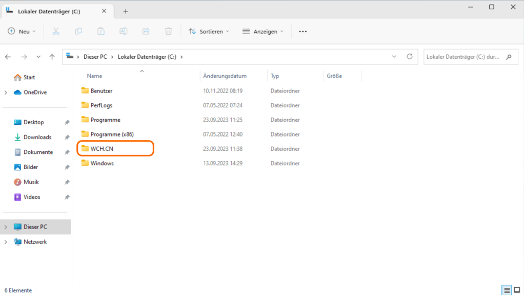 Schon zu diesem Zeitpunkt gibt es auf der lokalen Festplatte einen neuen Ordner WCH.CN (der nach der Installation nicht einmal aufgeräumt wird).