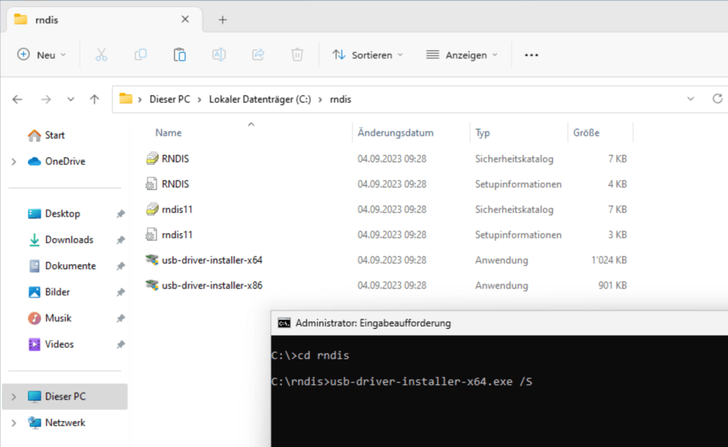 In der oben beschriebenen app-64.7z findet man einen Ordner rndis mit Treibern und einem Installationsprogramm. Auch die darin vorhandene Datei usb-driver-installer-x64.exe lässt sich mit dem Parameter /S ohne Benutzerinteraktion installieren.