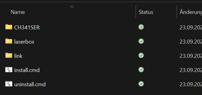 Damit ist das Vorgehen klar. Man erstellt einen Ordner mit dem Programm, einen mit dem passenden Link ins Startmenü und einen für den CH340 Treiber. Dazu zwei Batchdateien install.cmd und uninstall.cmd mit den Befehlen zur Installation resp. Deinstallation.