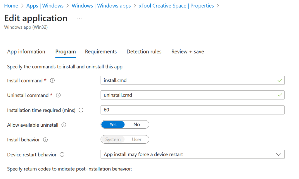 Diese lädt man auf Intune hoch und erstellt eine App mit den beiden Batchdateien als „Install command“ resp. „Uninstall command“: