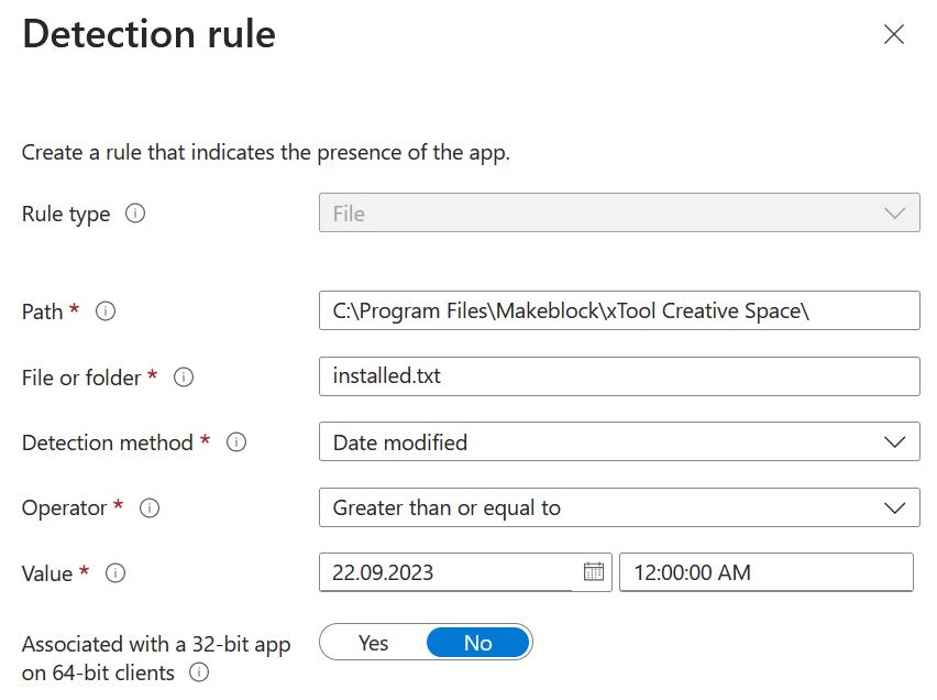 Als Detection rule überprüft man, ob die am Schluss des Installationsskripts erstellte Datei installed.txt neuer als ein Datum vor der Paketierung ist. So kann man bei einem Update sicherstellen, dass die neueste Version installiert wird. Beim ersten Mal könnte man auch einfach überprüfen, ob die Datei vorhanden ist.