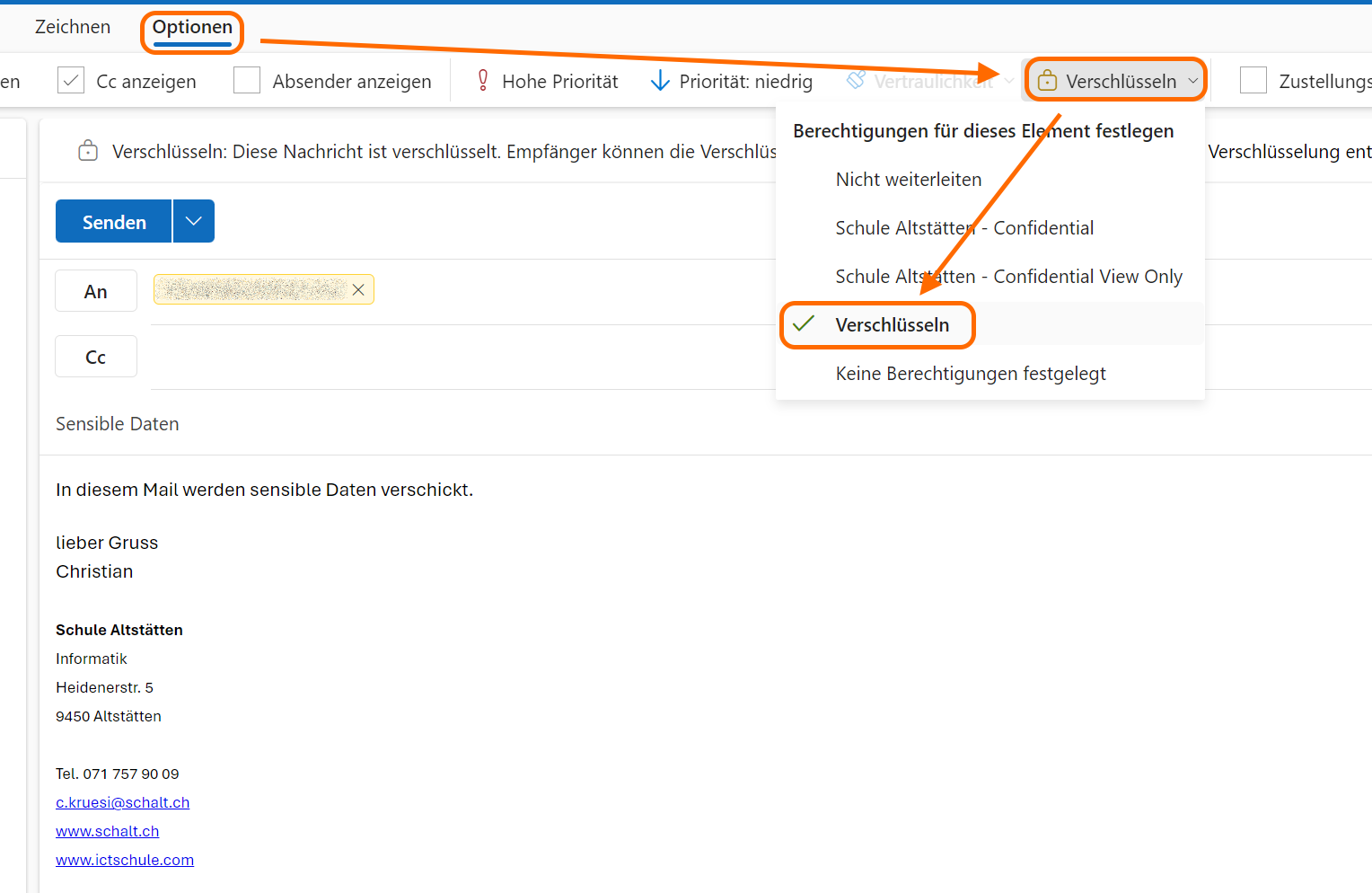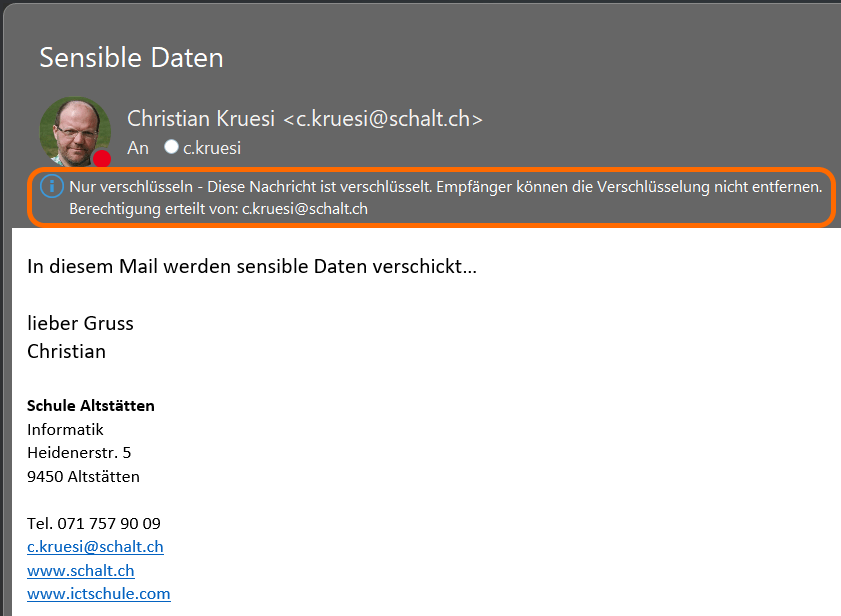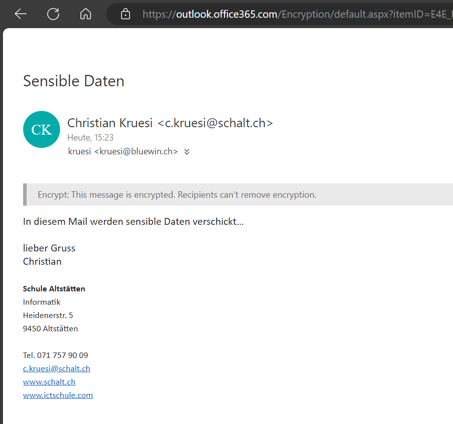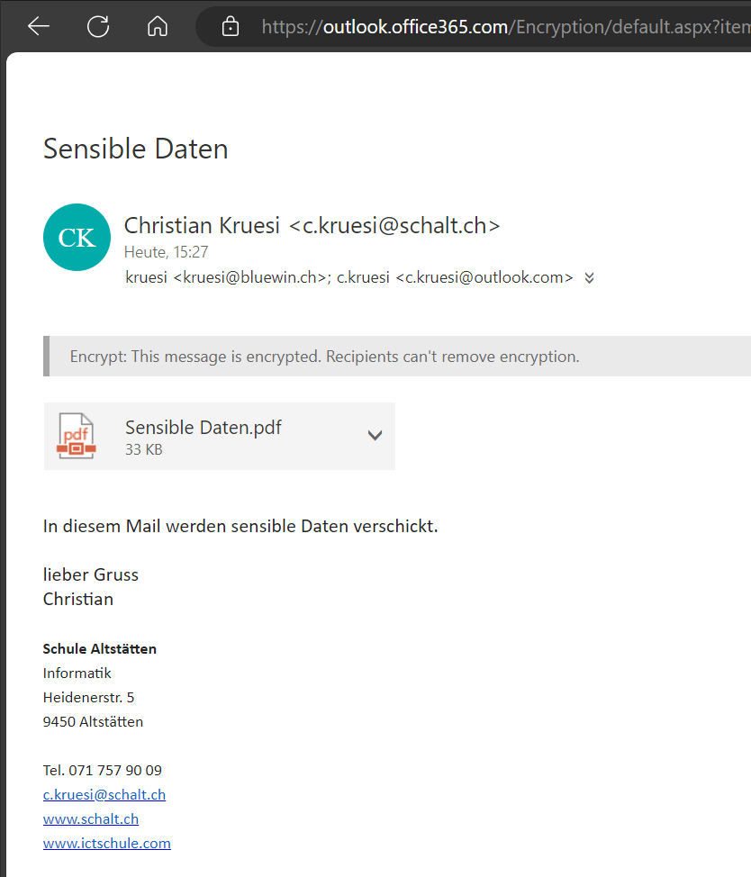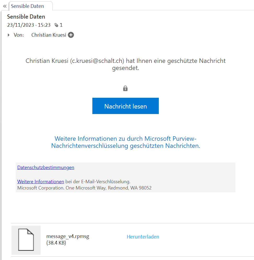 Wenn die Empfängerin oder der Empfänger ein Microsoft Konto einsetzt, kann man das Mail ganz normal öffnen, die Entschlüsselung passiert im Hintergrund. Die Nachricht enthält einzig einen Hinweis auf die Verschlüsselung.