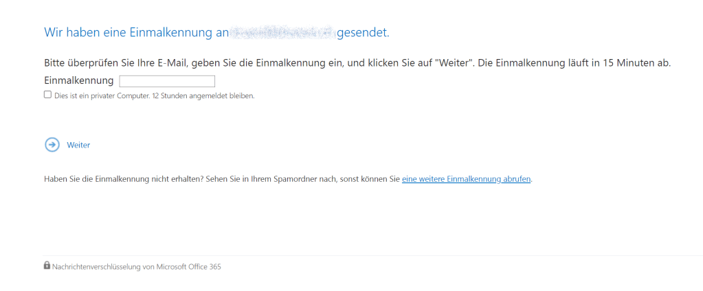 Sobald man die Einmalkennung eingetragen hat und auf „-> Weiter“ klickt, öffnet sich eine Webseite von outlook.office365.com (also nicht im Mailprogramm) mit dem Inhalt der verschlüsselten Mail.