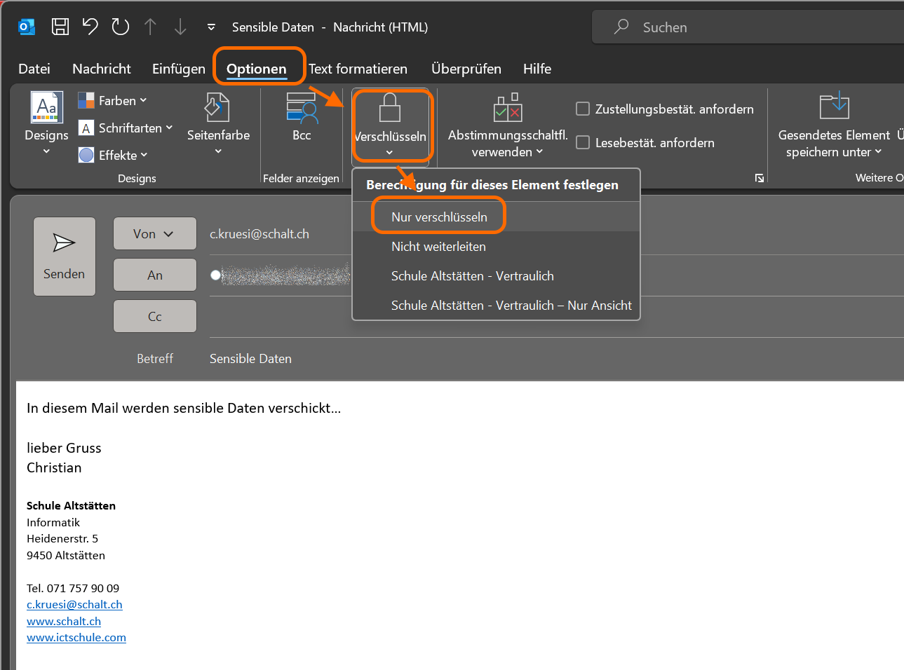 Um ein Mail zu verschlüsseln wechselt man zur Registerkarte „Optionen“ und wählt dort „Verschlüsseln“ -> „Nur verschlüsseln“.