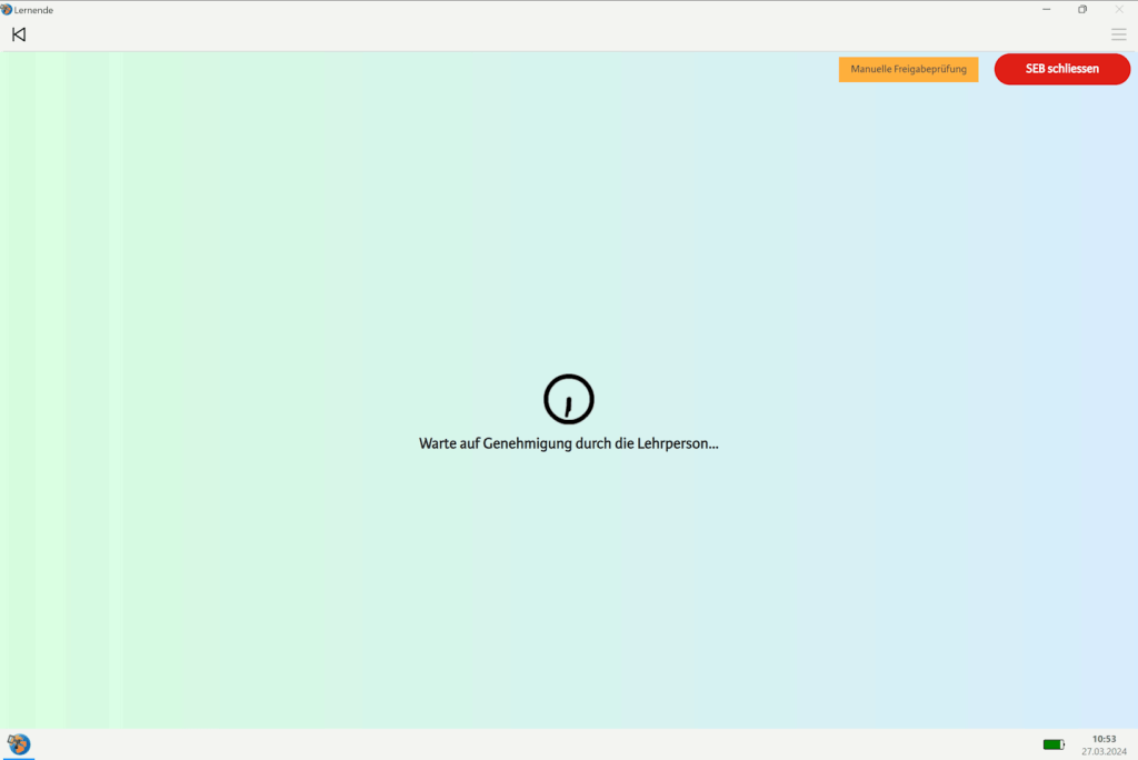 Danach wird eine laufende Uhr mit dem Hinweis „Warte auf Genehmigung durch die Lehrperson…“ angezeigt.