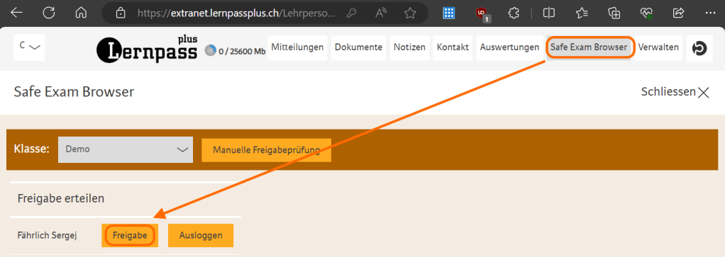 Als Lehrperson wählt man den Reiter „Safe Exam Browser“ und kann dann dort die Schülerinnen und Schüler in Wartebereit freigeben.