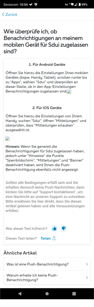 Wenn man auf „Geräteeinstellungen (iOS/Android) klickt, öffnet sich die Hilfe, in der beschrieben ist, wie man die Einstellungen des eigenen Handys anpassen kann.