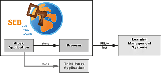 Die Kioskapplikation ist der SEB Browser, mit dem man eine Test-URL öffnen kann. Diese liegt häufig auf einem LMS (Learning Management System) wie Moodle, ILIAS oder OpenOlat. Im Bild grau angedeutet ist der Vollständigkeit halber noch die Möglichkeit, ausser dem SEB Browser andere Programme zu erlauben.
