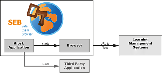Die Kioskapplikation ist der SEB Browser, mit dem man eine Test-URL öffnen kann. Diese liegt häufig auf einem LMS (Learning Management System) wie Moodle, ILIAS oder OpenOlat. Im Bild grau angedeutet ist der Vollständigkeit halber noch die Möglichkeit, ausser dem SEB Browser andere Programme zu erlauben.