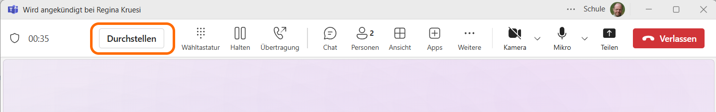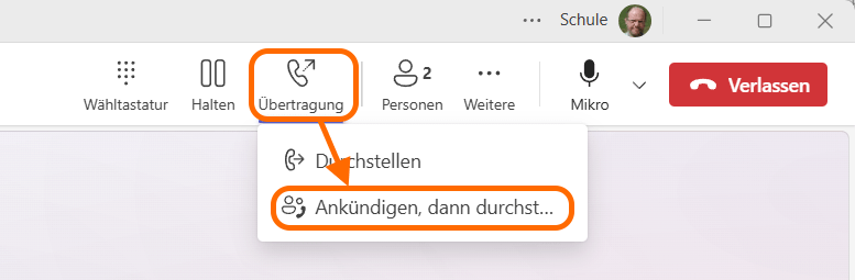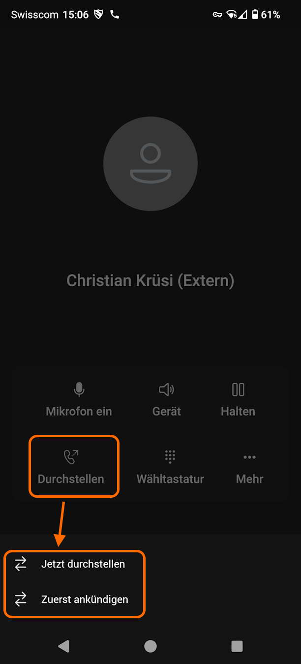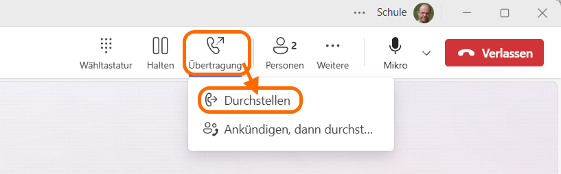 Oben rechts kann man einen Anruf „übertragen“. Die erste Möglichkeit ist „Durchstellen“: