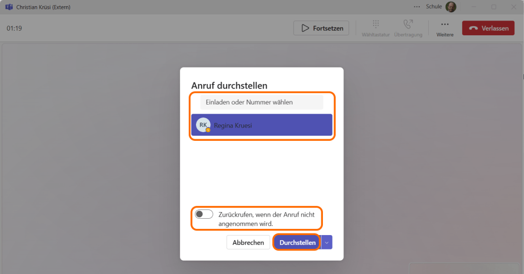 Nun kann man eine Person oder Nummer auswählen und dann den Anruf „Durchstellen“. Unten gibt es noch die Möglichkeit „Zurückrufen, wenn der Anruf nicht angenommen wird“ auszuwählen.