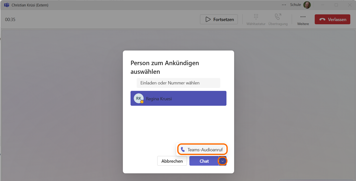 Wenn man die Person ausgewählt hat, kann man per „Chat“ oder per „Teams-Audioanruf“ zuerst nachfragen, ob es in Ordnung ist, die anrufende Person durchzustellen.