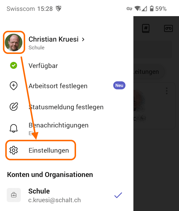 Auf dem Smartphone tippt man links oben auf das eigene Bild (wenn man kein Bild hochgeladen hat, besteht das Bild aus zwei Buchstaben des eigenen Namens). Hier kann man „Einstellungen“ wählen.