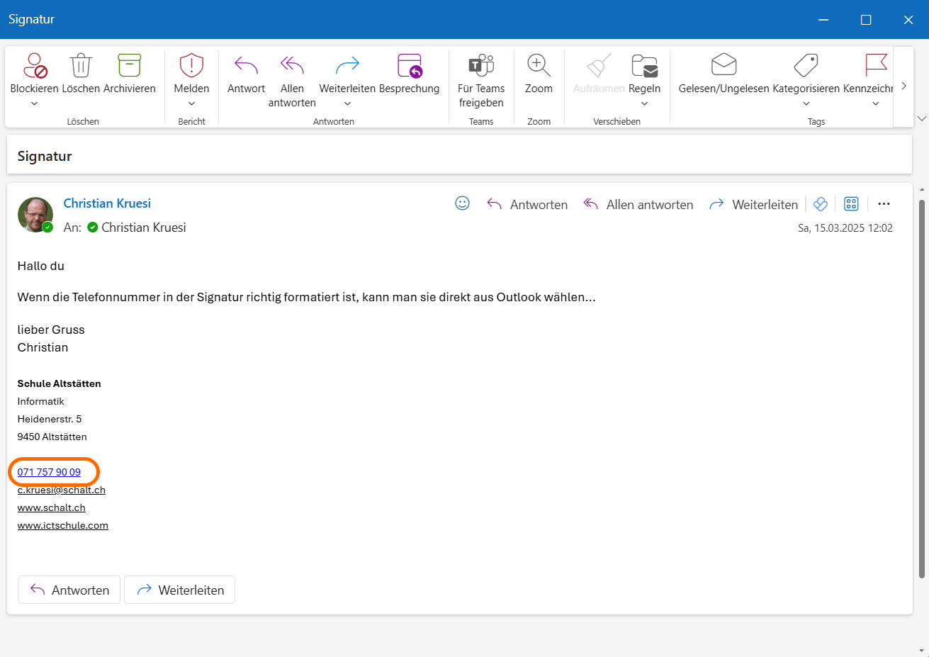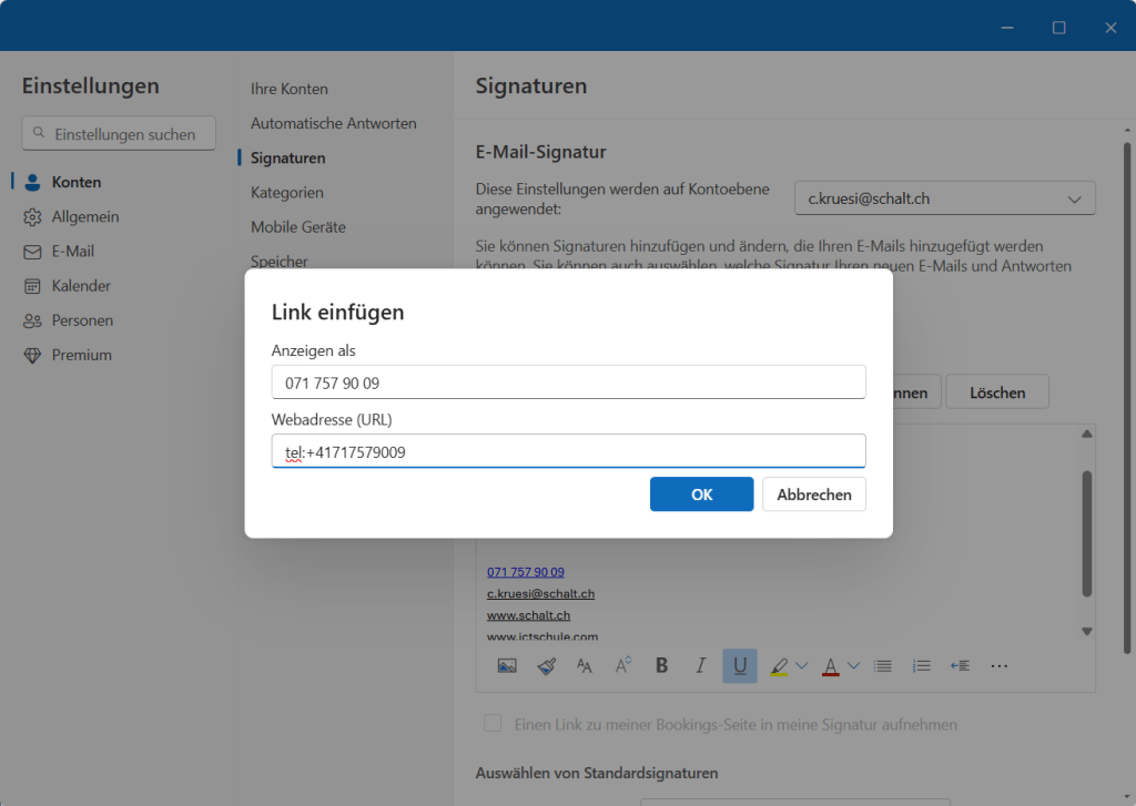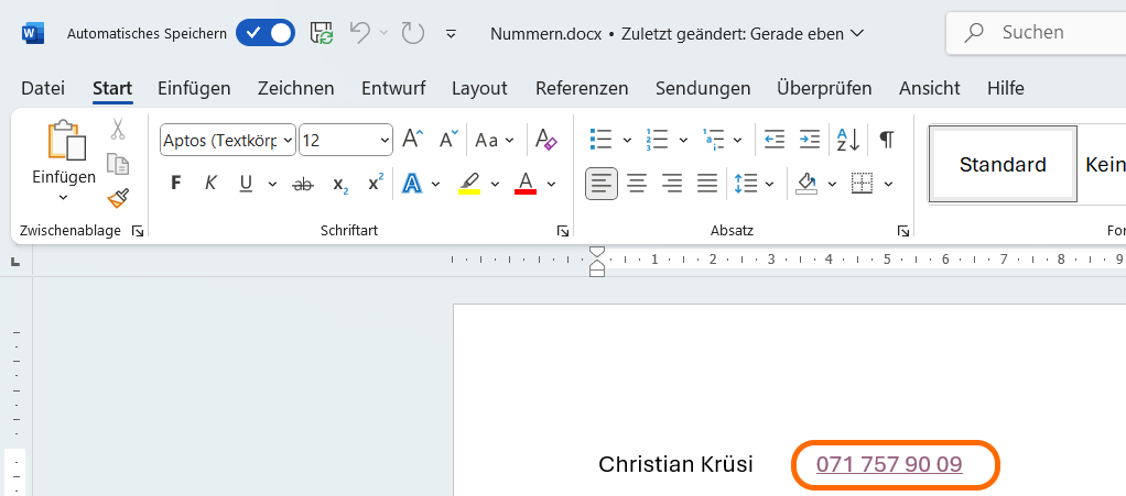 Damit man eine Telefonnummer direkt aus einer Signatur oder einem Worddokument wählen kann, muss sie richtig formatiert sein. Dazu kann man einfach einen Link einfügen (z.B. mit einem Rechtsklick oder mit der Tastenkombination ctrl+k) in der Form „tel:+41xyz“.