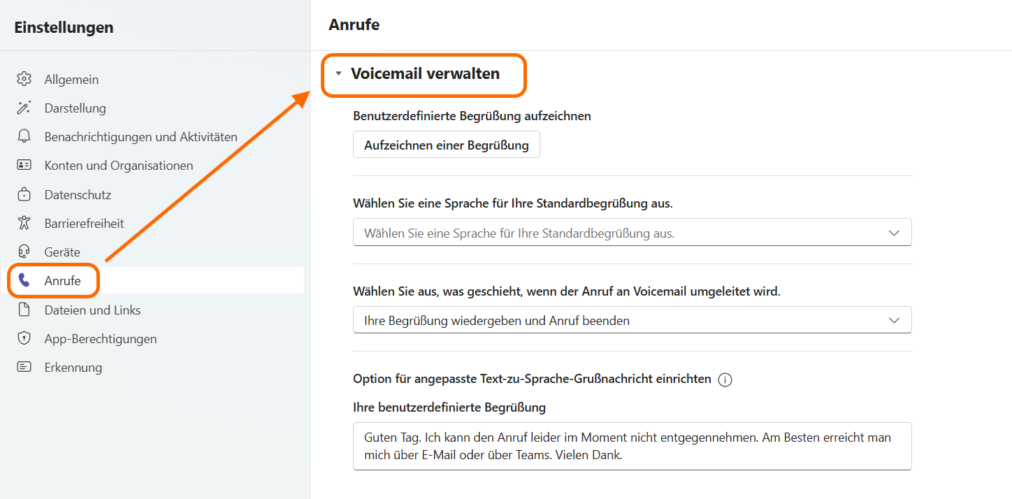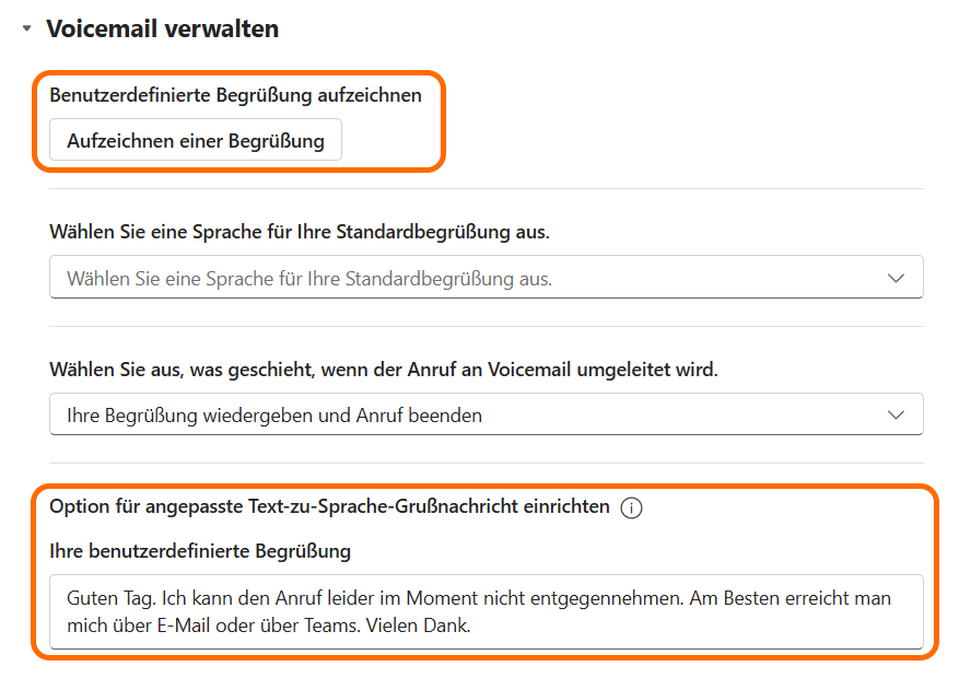 Man kann eine eigene Begrüssung einrichten, ansonsten wird einfach die Standardnachricht abgespielt. Hier kann man selber eine Begrüssung aufzeichnen oder man schreibt den Text und lässt die Computerstimme diesen vorlesen. Dann ist es aber wichtig, bei „Wählen Sie eine Sprache für Ihre Standardbegrüssung aus“ Deutsch auszuwählen – es tönt komisch, wenn eine Englisch sprechende Computerstimme den deutschen Text vorliest.