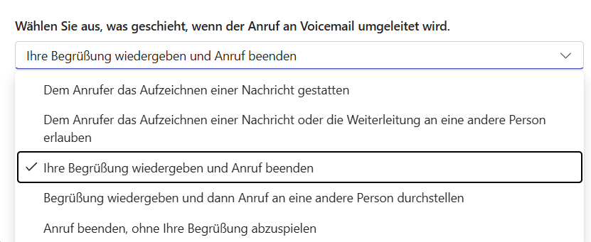 Über „Wählen Sie aus, was geschieht, wenn der Anruf an Voicemail umgeleitet wird“, kann man aus verschiedenen Möglichkeiten von „Nachricht aufzeichnen lassen“ bis zu „aufhängen“ wählen.