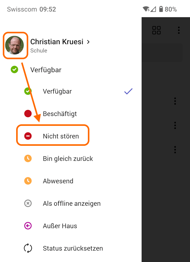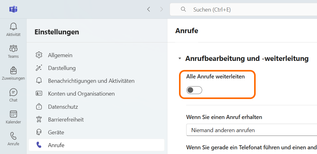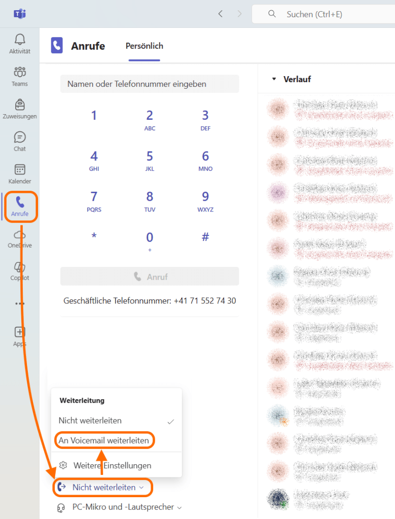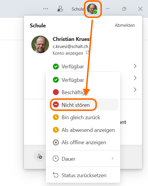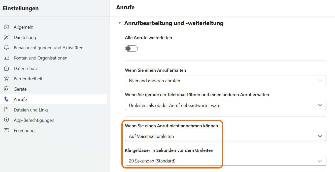 Wenn man z.B. während des Unterrichts nicht angerufen werden möchte, kann man oben rechts durch einen Klick auf das eigene Konto-Bild den Verfügbarkeitsstatus anpassen. Wenn dieser auf „Nicht stören“ gestellt ist, klingelt es nicht und es kommen die „Wenn Sie einen Anruf nicht annehmen können“ Einstellungen zu tragen. Im Bild oben wäre das nach 20 Sekunden klingeln umleiten auf Voicemail.