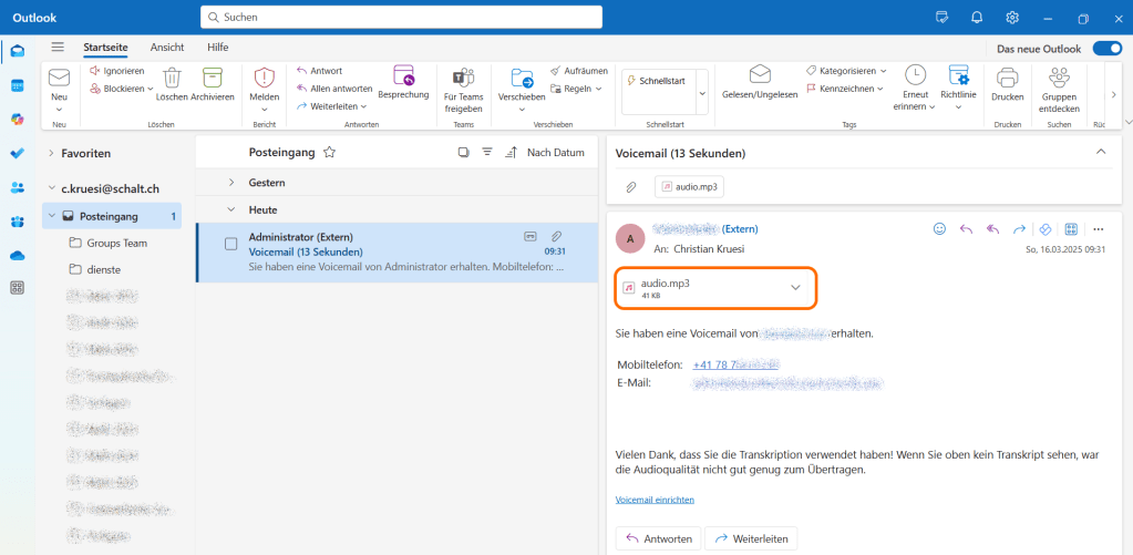 Ausserdem erhält man ein Mail mit der Nachricht als Anhang im MP3 Format: