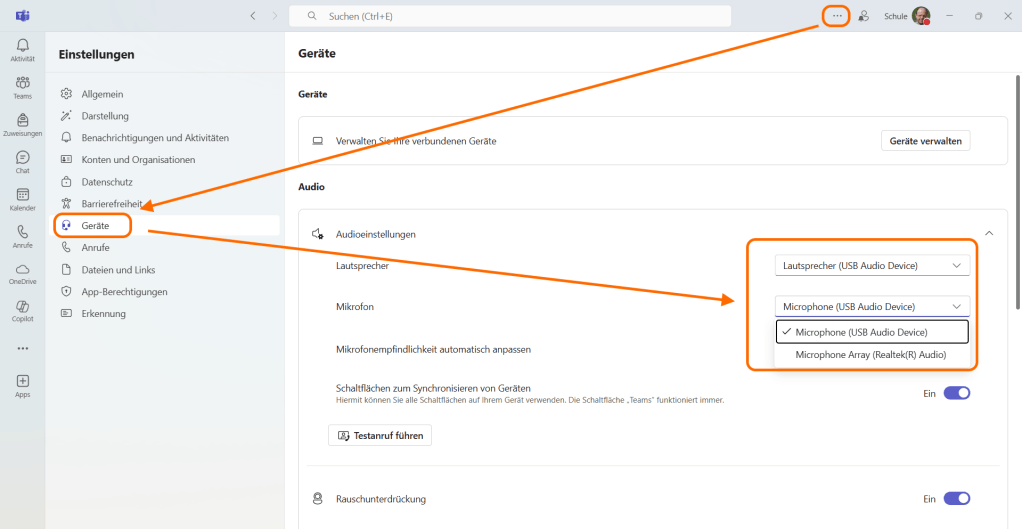 Falls einmal das falsche Audiogerät ausgewählt sein sollte, kann man über die 3 Punkte oben rechts zu den Einstellungen wechseln und „Geräte“ auswählen. Hier findet man nun Einträge für „Lautsprecher“ und „Mikrofon“ und kann diese ändern.