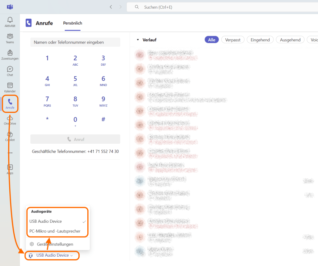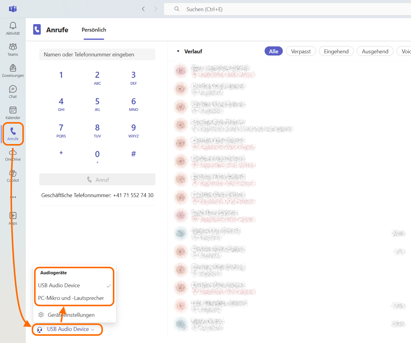 Alternativ kann man auch auf der Seite „Anrufe“ unten links schnell die „Audiogeräte“ auswählen.