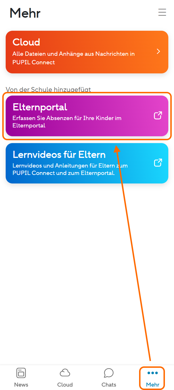 In Connect wechselt man unten rechts auf „Mehr“ und dann ins „Elternportal“.
