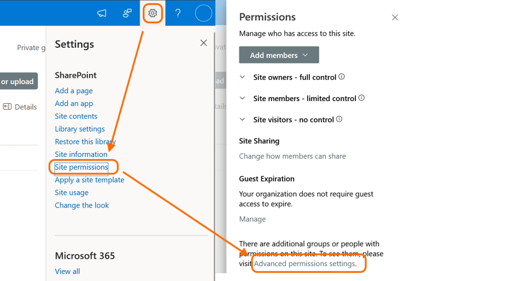 Wenn man in Sharepoint das Zahnrad oben und dann „Site permissions“ wählt, kann man unten noch „Advanced persmission settings“ auswählen.