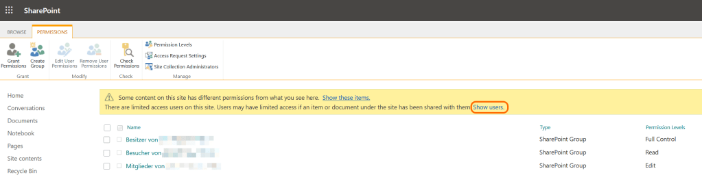 Obwohl also nichts mehr mit ihnen geteilt war, wurden diese Benutzer immer noch unter „There are limited access users on this site. Users may have limited access if an item or document under the site has been shared with them.“ angezeigt.