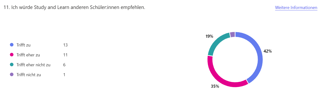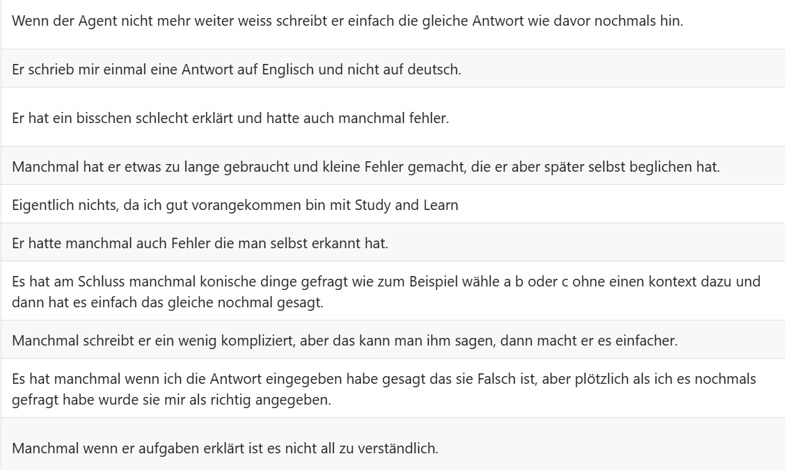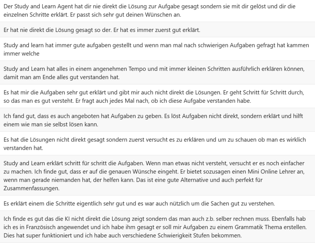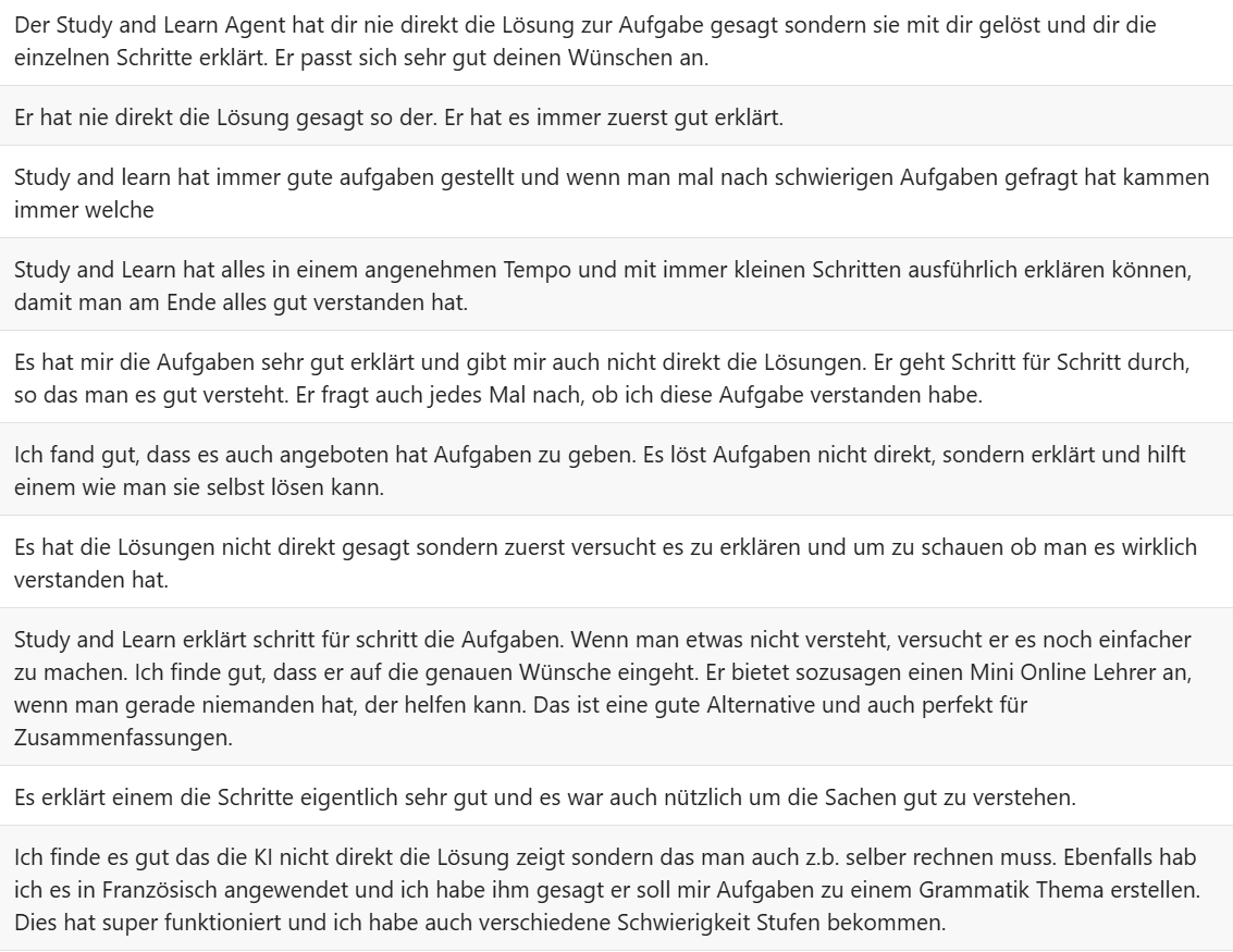Wir haben den Study and Learn Agent mit Schüler/-innen der 3. Oberstufe getestet, um die Resultate bei einer Fortbildung für Lehrpersonen aufzuzeigen. Das Thema der Klassen war Kugelgeometrie und ich hatte schon Angst, dass dies zu schwer sein könnte. Der Agent hat die Schülerinnen und Schüler aber sogar bei diesem schwierigen Thema erstaunlich gut unterstützt. Hier ein paar Rückmeldungen.
