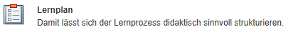 Der Lernplan ist eine Art Schaltzentrale für die verschiedenen anderen Werkzeuge. Man kann im Lernplan Aufgaben erstellen, die auf andere Werkzeuge verweisen (Höre dir den Dialog aus der Dateiablage an; Nimm bei der Umfrage teil; Lade dein Dokument in die Dateiablage hoch; Schreibe einen Beitrag ins Forum; …) und eine Reihenfolge der zu lösenden Aufgaben erstellen.